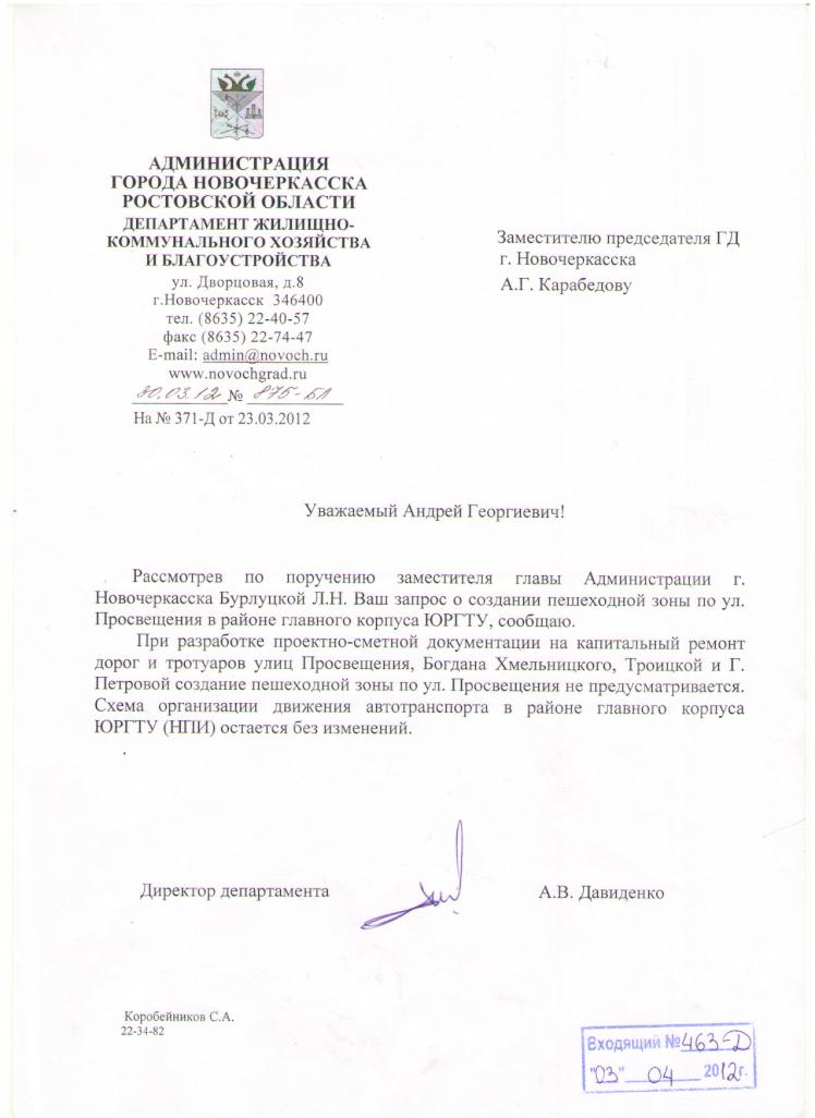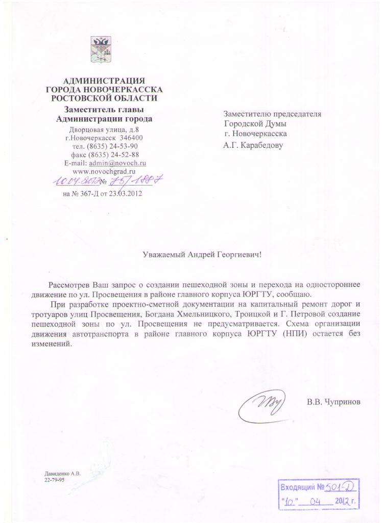 По поручению жителей округа прояснил ситуацию с пешеходной зоной по улице Просвещения от Пушкинской до ул. Б.Хмельницкого. Из ответов администрации следует, что от абсурдной идеи перекрыть улицу напротив главного корпуса ЮРГТУ решено отказаться.